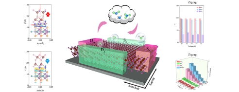 铁电材料因其自发极化特性被广泛用于各种应用中,利用其自发极化特性可以调节表面电荷分布,显著增强对极性分子的吸附和识别。其中,作为典型的二维铁电材料,In2Se3因其窄带隙特性和卓越的环境稳定性被广泛应用于非易失性存储器、场效应晶体管和应变工程功能器件等领域。在本研究中,通过密度泛函理论和非平衡格林函数方法分析了多种气体分子(H2S、NH3、NOx和SOx)在In2Se3表面的吸附行为,并研究了基于Fe3GeTe2/In2Se3的气体传感器的传感性能。首先,针对NO2、NO3和NH3,计算并分析了P↑态与P↓态气体传感器的I-V特性。P↑态传感器对NO2和NO3的最大灵敏度分别为98.5%和95.43%。随着In2Se3的极化切换,P↓态气体传感器对NO3展现出高选择性,最大灵敏度达99.11%。其次,P↑态气体传感器在干燥与潮湿环境下的传输电流差异小于4%,在保持对NO2和NO3高灵敏度的同时展现出优异的抗湿性。最后,探讨了电极材料对传感器性能的影响,结果显示采用BPN/In2Se3电极的气体传感器对NH3表现出高选择性,最大灵敏度达97.85%。总体而言,这些结果表明Fe3GeTe2/In2Se3和BPN/In2Se3不仅验证了铁电材料在气体传感中的核心优势,还为功能化二维异质结的设计提供了新见解。